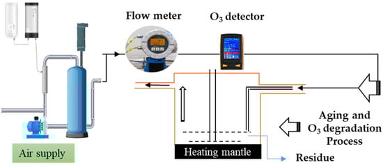 Ozone is an alternative oxidizer offering a more efficient and environmentally friendly solution, increasing reaction efficiency, reducing emissions, improving the mechanical properties of bitumen, and providing a sustainable alternative to traditional air-blowing methods. Air-blowing treatment conducted with O3 gas requires a proper experimental setup, as presented in Figure 1, to cope with the process parameters that are crucial to ensure the treatment quality. This process emits approximately 1.2–1.5 kg of CO2 per ton of bitumen, along with polycyclic aromatic hydrocarbons (PAHs) at concentrations of up to 0.8 mg/m3, depending on the production conditions, which poses a critical challenge for industries [8]. The energy consumption and release of hazardous byproducts such as PAHs in the air-blowing process lead to significant environmental and health risks [8,9]. This innovation is in line with global sustainable development efforts, ensuring the development of a robust and environmentally friendly road infrastructure.