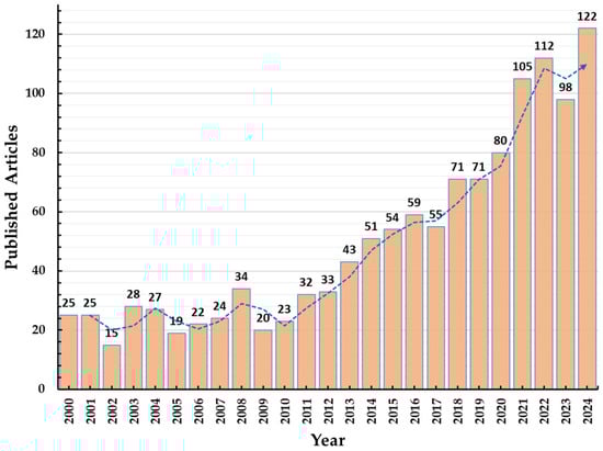 Number of publications per year (2000–2024) on the oxidation of bitumen via air-blowing and ozone treatment. Data were retrieved from Scopus using the term “bitumen oxidation” in article titles, abstracts, and keywords.