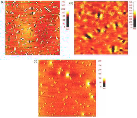 AFM topographical images (all 40 × 40 µm2) of binder AAK-1 as a function of film thickness: (a) 1 µm film (z-scale = 350 nm), (b) 0.1 µm film (z-scale = 90 nm), and (c) 0.01 µm film (z-scale = 300 nm) [46] (Reproduced with permission from Xiaokong Yu, Advances in Colloid and Interface Science, Elsevier, 2015).