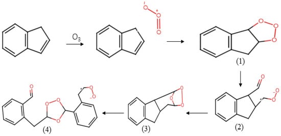 Ozone is a triatomic allotrope of oxygen that has the formula O3, a strong oxidizing agent that is highly reactive and, therefore, can readily cleave chemical bonds. This can occur through electrophilic modes such as interactions with unsaturated hydrocarbon preservatives to produce oxygen-rich products such as carboxylic acids and peroxides [69,70]. For instance, it can easily open up aromatic rings in wastewater, lowering the chemical oxygen demand (COD) and enhancing biodegradability [71]. In the mechanism of bitumen ozonation, this improves polarity, leading to products that are less biotoxic with more potential for industrial applications [72]. In addition, ozone is known to possess antimicrobial activity as well as controlled reactivity, which makes it well-suited to both chemical and biochemical usage [73,74]. According to the investigation of Boczkaj et al. (2017), ozonation enables better removal of biotoxic compounds and higher biodegradability compared to other oxidation processes [75]. In the treatment of wastewater from the production of bitumen, ozonation improved the reduction in COD by 40–50% and that in total organic carbon (TOC) by up to 80%. Moreover, the results showed a great enhancement in biodegradability because the biochemical oxygen demand over 5 days or chemical oxygen demand (BOD5/COD) ratio increased by more than 0.4 in the ozonated samples, demonstrating that ozone is more efficient in degrading other complex hydrocarbons into harmless and environmentally friendly compounds than other emerging advanced oxidation processes (AOPs), stressing its applicability in minimizing adverse environmental effects in industries [75]. In Figure 6, the Criegee mechanism is highlighted, which has a higher selectivity of addition products during indane or indene ozonation at higher conversions. First, 1,3-dipolar cycloaddition occurs to form 1,2,3-trioxolane (Figure 6(1)), which is followed by C–C bond fragmentation to further form a carbonyl-peroxide intermediate (Figure 6(2)). The intramolecular reaction in indene gives rise to ozonides, and further oxidation leads to intermolecular reactions with carbonyls, where dimeric ozonides are formed (Figure 6(3)). This mechanism is consistent with that in other studies carried out on asymmetric olefins and carbonyl-containing reaction mixtures [76].