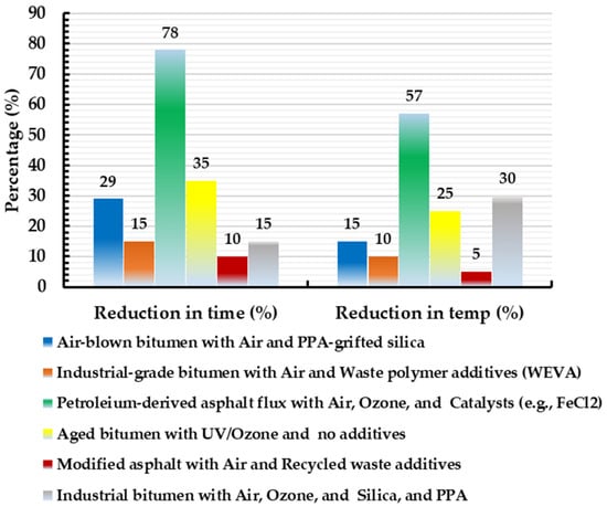 There are a variety of methods and raw materials for bitumen improvement, demonstrating remarkable differences in reductions in time and temperature, and effectiveness for a wide range of purposes and applications. The ozone treatment of bitumen through oxidation benefits the process by accelerating the material’s development, particularly lowering production temperatures. As observed in Table 3 and Figure 7, the combination of ozone treatment and catalysts such as FeCl2 provides the most efficient bi-product in petroleum-derived asphalt flux through its ability to reduce the processing time by 78%, along with a 57% reduction in temperature, as Table 3 and Figure 7 illustrate.