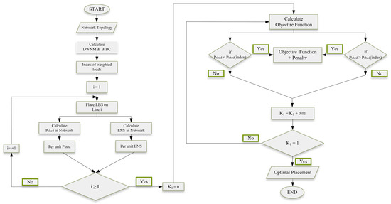 In this algorithm, we are trying to optimally cut the less important loads so that the high priority (vital) loads are maintained and, at the same time, have the least amount of undistributed energy. According to the government’s view on the importance of the household, agricultural, or industrial loads of consumers, as based on the indicators considered by the government, these loads are classified into three levels: low importance, ordinary, and high importance. The method we proposed in this study, a method based on repetition, determines the location of the TCLBS randomly in each step of the search, and in different states, the switch is considered active and inactive. For each combination, the vector V indicates the active or inactive state of the TCLBS, and Pshed is the amount of load that is interrupted by activating the specified TCLBS in the V and is calculated at each step of the search. The value of the objective function (OF), which is the sum of the two main objectives of this research, is calculated for each combination. In fact, if K1 and K2 = 1 − K1 are the coefficients of these two objectives, this objective function is designed to prioritize preserving high-priority loads with greater value and practically preventing their disconnection while also aiming to minimize the amount of energy not supplied in the network. Therefore, our goal in this study is to minimize the objective function, and by using this method, we have achieved very good speed in computations and finding optimal points. If K1 = 1, it means we consider the importance of the first objective, which is load shedding, as 100%, and the importance of the second objective, which is reliability, as 0%, and we expect the critical location where the switch is placed to exclude low-importance load points from the circuit without considering the minimum unsupplied energy. Also, if K1 = 0, it means that the importance of the first goal, which is load shedding, is 0%, and the importance of the second goal, which is reliability, is 100%, and we expect the TCLBS location to be located at the end of the network or branches, regardless of the important loads, so that the least amount of energy is lost. Also, based on the and values, a penalty is added to the objective function to ensure that the shed load is less than the required shutdown value and to exclude excessive shed load values from the search with a penalty. The calculations of this research are based on the BIBC matrix and the PL and Wn vectors, which play an important role in understanding the load distribution and its priorities in the network. We highlight the advantages of our search-based approach, which leverages graph theory, compared with metaheuristic algorithms such as the Genetic Algorithm (GA) and Particle Swarm Optimization (PSO), particularly in terms of computational efficiency and solution quality. The proposed method systematically explores the solution space by gradually determining the optimal location of TCLBSs using search techniques in different states and the key status within the network while also utilizing the concepts of graph theory. This ensures that high-priority loads are preserved while minimizing Energy Not Supplied (ENS). One of the key advantages of this graph-based approach is its significantly reduced computational complexity compared with population-based methods like the GA and PSO. While the GA and PSO require multiple iterations and population updates, leading to increased computational overhead, our method directly evaluates candidate solutions based on the topology and load priorities in the network, enabling faster convergence and minimal computational cost. This makes the method highly suitable for real-time applications in large-scale distribution networks.