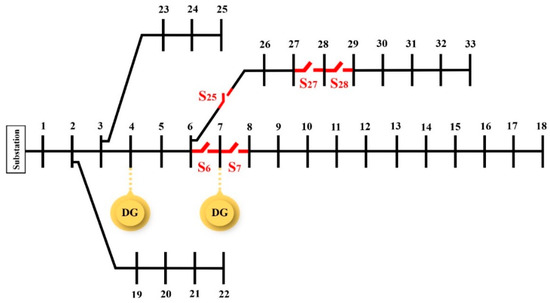 Figure 2 and Table 2 illustrate the single-line diagram of the 33-bus test network and the importance ranking of the network loads, respectively. In the 33-bus test network [30], the simulation results are presented with and without the presence of distributed generation (DG) units in two scenarios.