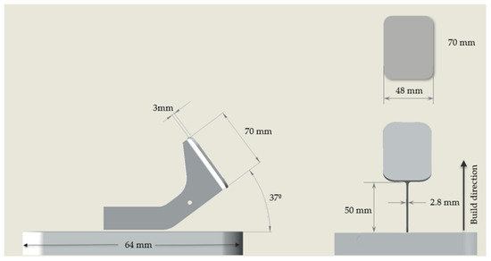 The dry milling process was performed on an SLM component, as shown in Figure 1. The component consisted of a platform measuring 70 mm × 48 mm with a thin-wall support of 2.8 mm thickness, attached to a base measuring 64 mm × 64 mm with a thickness of 32 mm.