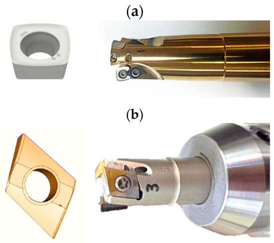 (a) Image of cutting tool XDLX 09T308ER-F40 CTC5240 and the tool holder GA SD090 C 032 Z3; (b) Image of cutting tool T290 LNMT 100405TR IC808 and the tool holder T290 ELN D20-03-W20-10.