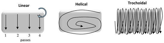 All tests were performed using a CNC machining center, the five-axis HAAS UMC-750. Initial trials to determine the best trajectory (trochoidal, helical, and linear) examined milling parameters such as feed per tooth (Fz) and axial depth of cut (Ap). The cutting tool used in these tests was the XDLX 09T308ER-F40 CTC5240, paired with the holder tool GA SD090 C 032 Z3, which had a diameter of 32 mm. This configuration was referred to as Setup 1 (see Figure 2a). Figure 3 illustrates a schematic of the three different trajectories used in the initial trials. The linear trajectory was performed with a total of four milling passes for each component to machine the entire surface. Table 2 presents the variation in feed per tooth (Fz) and axial depth of cut (Ap) for each sample. The fixed milling parameters for all these tests were cutting velocity (Vc) at 60 m/min, radial cutting depth (Ae) at 80%, feed rate (Vf) at 229 mm/min, spindle speed (n) at 764 rpm, and number of effective edges (Zc) at 3. The parameters selected for this study are based on a substantial amount of the literature and references related to titanium machining. A summary can be found in [21], while more specific references for dry conditions, similar 3D printing techniques, and the milling process are provided in [22,23,24]. Taking into account the reference data, as well as the specifications of our tools and system, the milling parameters and their variations were defined.