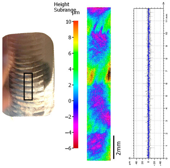 The surface quality of the machined components was assessed using Ra and RSM values, both of which represent surface roughness but are calculated differently. Ra, or Roughness Average, is determined as the arithmetic average of a surface’s measured microscopic peaks and valleys. RSM is the arithmetic mean value of the widths of the profile elements of the roughness profile. The roughness images were acquired using an infinite focus microscopy (Alicona Infinite Focus SL, Alicona Imaging GmbH, Graz, Austria) and data analysis was performed with MountainsMap 5.1 software, adhering to ISO 4287 and ISO 25178 standards [25,26]. The analysis involved the evaluation of the absolute ordinate Z(x) within the sampling length. Figure 4 illustrates an example of a component surface area measured by the optical profilometer, including the 3D image obtained and the graph showing the variation of the roughness.