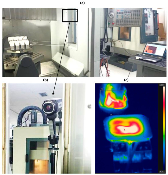 (a) Experimental setup with the five-axis CNC machining center, the HAAS UMC-750. Inside, the SLM component is visible, and the black square indicates the location of the infrared camera; (b) FLIR SC645 high-resolution LWIR infrared camera; (c) Example of an infrared image acquired by the infrared camera. The two registered temperature areas are represented by two rectangles. The bottom rectangle focuses on the component temperature, while the top rectangle focuses on the tool temperature. The red triangles indicate the maximum temperature in each area.