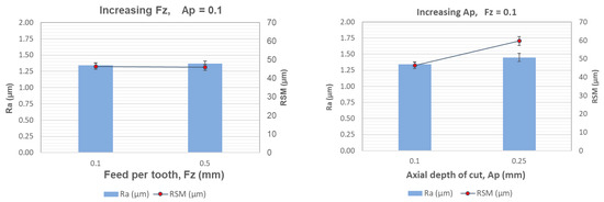 Figure 6 and Table 3 show how the roughness parameters Ra and RSM, as well as the maximum temperature changes during the four milling passes, are affected by the increase in Fz and Ap. It was observed that increasing the Fz parameter 0.1 and 0.5 mm had no significant effect on either surface roughness or temperature. In contrast, increasing Ap from 0.1 to 0.25 mm caused a marked degradation, particularly in the RSM roughness parameter. The measured roughness parameters of Ra were consistent and comparable with other references [24,28], where milling was performed under dry conditions. Moreover, the maximum temperature obtained with the Fp and Az 0.1 values is similar to the ones obtained in [19], but for this reference, the machining was the turning, not the milling, as it is focused on work.