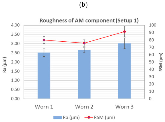 Figure 10 shows the correlation between three different levels of cutting tool wear and the corresponding roughness parameters (Ra and RSM) for Setup 1 and Setup 2. While the roughness parameters increase with the progression of tool wear in Setup 1, Setup 2 maintains consistent Ra and RSM values. This is because the cutting tools in Setup 2 experienced less wear, despite both setups having the same workload. The comparison of cutting tool damage is provided in detail in the following section.