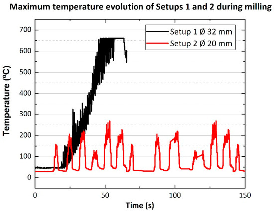 Temperature evolution recorded by the infrared camera for Setup 1 and Setup 2 during the milling process with a trochoidal trajectory.
