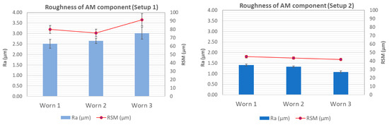Evolution of Ra and RSM roughness parameters with the three levels of tool wear for Setup 1 and Setup 2.