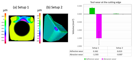 Figure 11 displays an example of the 3D overlapped images used to measure the adhered and removed material of the cutting edge of tools. The color thresholding technique is used to represent the differences in terms of picks (adhered material) or valleys (removed material). The yellow and aqua colors indicate the initial surface of tools corresponding to Setup 1 and Setup 2, respectively. In both cases, the valley areas are represented with blue/magenta colors, where tool of Setup 1 achieved deeper values (~600 mm) than Setup 2 (~80 mm). The bar graph shown in Figure 11 corresponds to the measurements of all worn tools evaluated in this work for both setups. In this case, the quantification of removed and adhered material is expressed in terms of volume (mm3). Results indicate that tools used in Setup 1 presented a higher volume of worn material, which is visible in 3D images as chipping and spalling of large particles at the cutting edge. Even more, the volume of adhered material was also higher than the tools of Setup 2. These phenomena can be attributed to the severe machining conditions, where high temperatures were achieved (around 600 °C), as shown in Figure 9, promoting the tool brittleness.
