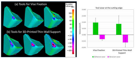 In this final subsection, the effect of fixing the component with a vise versus using its own 3D-printed thin-wall support was analyzed. Figure 12 shows 3D images of the cutting edge for both conditions using Setup 2. As observed, both tools exhibit good performance compared to Setup 1 (as shown in Figure 11), whether fixed with the vise or the thin-wall support. However, the second condition, using the 3D-printed thin-wall support, showed an increased wear on the cutting tool. In this case, magenta colors show the deepest values (~100 mm) for the 3D-printed thin-walled supported component. Even with the use of coated tools, these dry machine conditions induced premature damage, and it is attributed to the presence of higher vibrations.