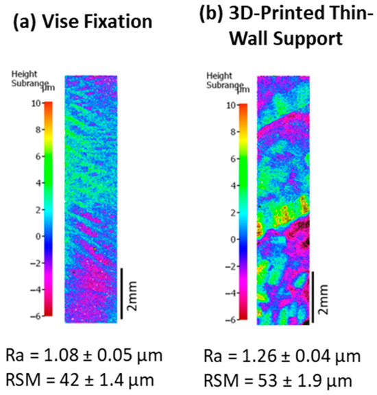 Three-dimensional surface images of the milled, 3D-printed Ti-6Al-4V surface fixed with the (a) vise and (b) thin-walled supported for Setup 2 and the Ra and RSM roughness values.