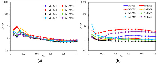 Variation in dimensionless DL (DL/D) along flow direction from M-PM1 to M-PM8 under different Pe. (a) Pe = 0.01. (b) Pe = 0.1. (c) Pe = 1. (d) Pe = 10. (e) Pe = 50. (f) Pe = 100.