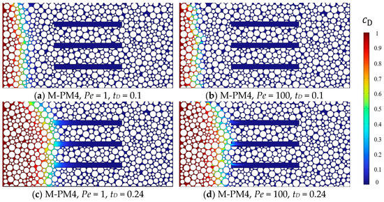 At Pe = 0.01, diffusion dominates transport within M-PM models, resulting in minimal variation in DL/D at the outlet across all the cases, with values converging approximately at 0.75 (Figure 7a). These minor numerical differences arise from variations in porosity due to different microfracture characteristics, where porosity ranges from 0.292 to 0.341. Under these conditions, DL/D = 1/Fφt remains valid. Further derivation indicates that F varies from 3.9 to 5.46, aligning with predictions for unconsolidated packed porous media based on Archie’s equation (F = 1/φt1.3) [50] and Fricke’s equation (F = ((x + 1) − φt)/xφt, x = 2 for spheres) [51]. However, at Pe = 0.1, DL/D for M-PM1, M-PM2, and M-PM8 deviate from DL/D = 1/Fφt correlation, whereas the other M-PM models retain this intrinsic relationship (Figure 7b). This discrepancy is attributed to horizontal microfracture channels, which introduce heterogeneity and disrupt the stability of the displacement front (Figure 8). These results indicate that even under diffusion-dominated conditions (Pe < 1), the presence of a single microfracture or highly connected microfracture networks in the flow direction can lead to deviations from DL/D = 1/Fφt. Additionally, instability in DL near the inlet boundary (Figure 7a,b) is observed, resulting from the rapid attainment of injection concentration in the numerical solution over a short period, leading to reduced agreement with analytical solutions. At Pe ≥ 1, the combined impacts of advection and diffusion on CO2 transport become increasingly significant, with DL exhibiting an upward trend across all the M-PM models (Figure 7c–f). This increase is driven by two key mechanisms. Firstly, the complex spatial structure of M-PM models induces variations in the velocity field, while concentration gradients alter the viscosity field, further promoting velocity heterogeneity. Together, these factors distort the displacement front within the matrix region, increasing the contact area between the displacing and displaced fluids. Secondly, a higher Pe leads to earlier solute breakthroughs in the presence of microfractures, shortening the time available for convective mixing and spreading. This impact expands the concentration distribution range, ultimately resulting in a larger DL.
