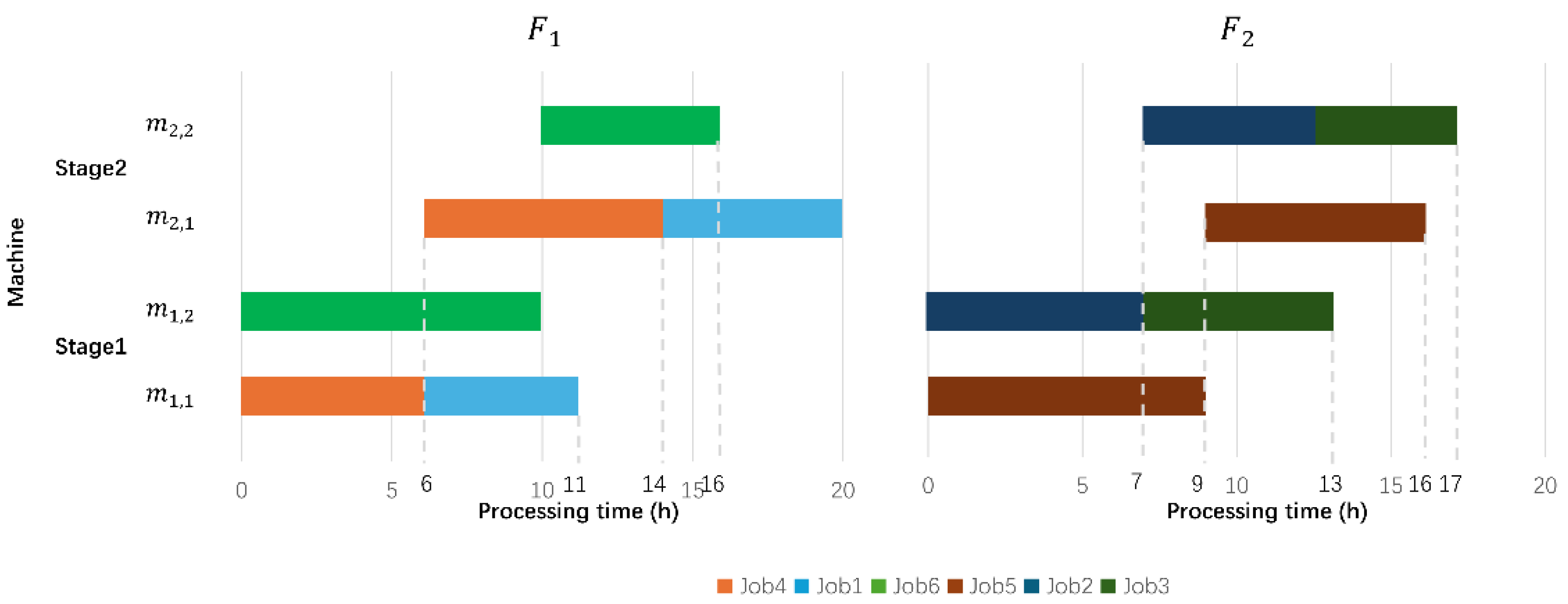 - Cui, H.; Li, X.; Gao, L. An improved multi-population genetic algorithm with a greedy job insertion inter-factory neighborhood structure for distributed heterogeneous hybrid flow shop scheduling problem. Expert Syst. Appl. 2023, 222, 119805. [Google Scholar] [CrossRef]