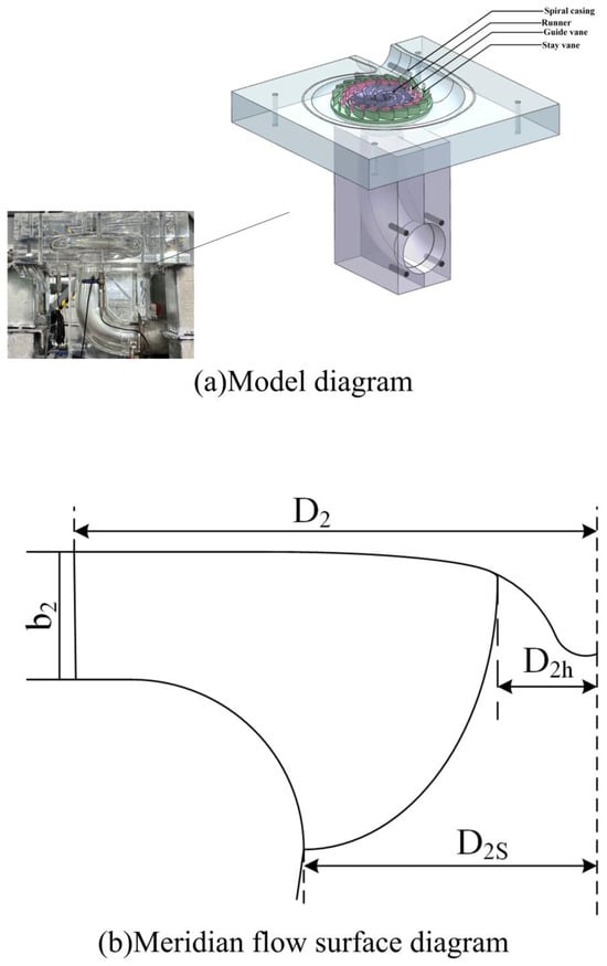 This study focuses on a model of a pump turbine, as illustrated in Figure 1a. The unit primarily consists of several flow components, including the volute, fixed guide vanes, movable guide vanes, a runner, and a draft tube. A schematic representation of the meridional flow surface is provided in Figure 1b. Specific parameters of the unit, such as the runner speed, design flow rate, and design head, are detailed in Table 1.