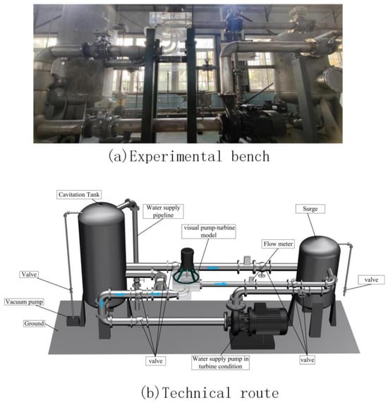 The experiment was conducted on a closed-loop water pump turbine test rig, as illustrated in Figure 2. The experimental setup included force sensors, data acquisition instruments, and solenoid valves. Pressure gauges were installed at the inlet and outlet of the water pump turbine unit to measure pressure, allowing for the calculation of the pressure differential across the pump turbine. Additionally, a flow meter was utilized to determine the flow rate within the system.