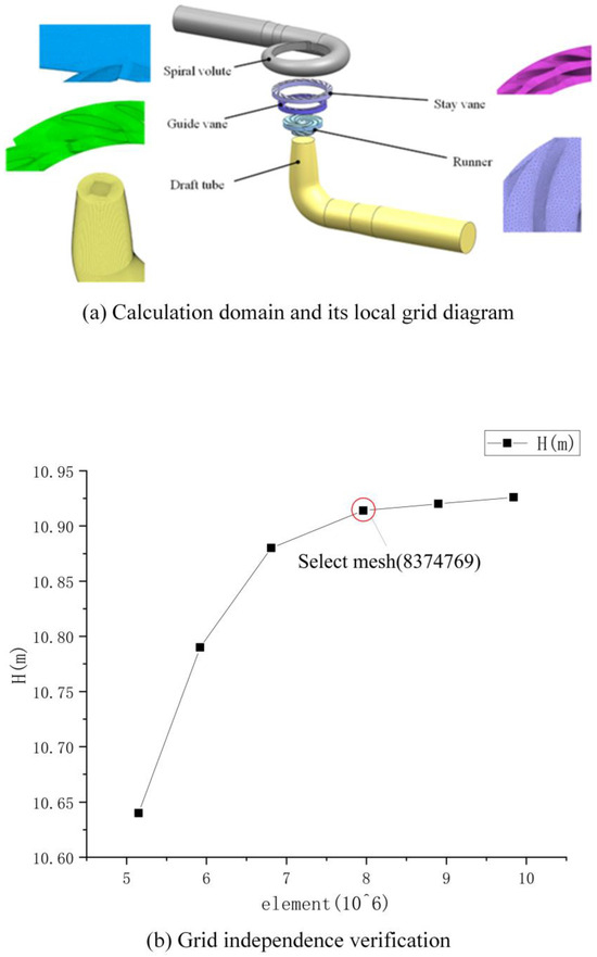 Numerical simulation of the flow field was conducted using the ANSYS Fluent 2020 R2 computational software. Figure 3 illustrates the computational domain and the grid schematic, which consists of five flow components, namely the volute, fixed guide vanes, movable guide vanes, a runner, and a tailwater pipe. The computational domain was pre-processed for grid generation using commercial software. Hexahedral mesh elements were employed for the fixed guide vanes, movable guide vanes, and tailwater pipe, while tetrahedral mesh elements were utilized for the volute and runner, as depicted in Figure 3a. To minimize computational resource expenditure while ensuring the accuracy of the results, the independence of the grid was verified by examining the head rise. As shown in Figure 3b, the increase in the head rise of the pump turbine diminishes progressively with an increase in the number of grid elements.