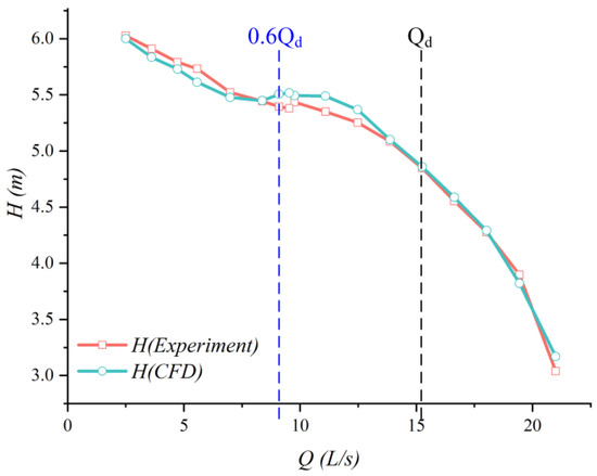 In this study, head values under different flow conditions were obtained experimentally, and corresponding numerical simulations were conducted for each test case to derive the flow–head (Q-H) curve. Due to system leakage and limitations in instrument precision, the numerical simulations could not fully replicate experimental conditions, resulting in discrepancies between the two datasets. However, as shown in Figure 5, the relative error remained within 5%, which is acceptable and confirms the accuracy of the numerical simulations, thereby validating their use for subsequent analyses. The Q-H curve reveals that as the flow rate decreases, the head gradually increases until reaching approximately 60% of the design flow rate (0.6 Qd), where the curve exhibits a positive slope region—the hump region. Giovanna et al. [27] identified a strong correlation between hump characteristics and rotor–stator interactions in this region, prompting this study to focus on the cavitation flow field under the 0.6 Qd condition for in-depth investigation.