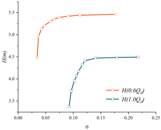 Numerical simulations of cavitation characteristics were conducted for the conditions of 0.6 times Qd and Qd. The resulting cavitation characteristic curves are illustrated in Figure 6, where the horizontal axis represents the cavitation coefficient defined in Equation (17), and the vertical axis indicates the head corresponding to the respective cavitation number.