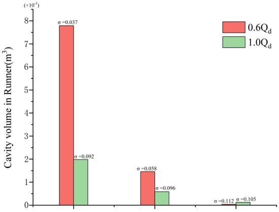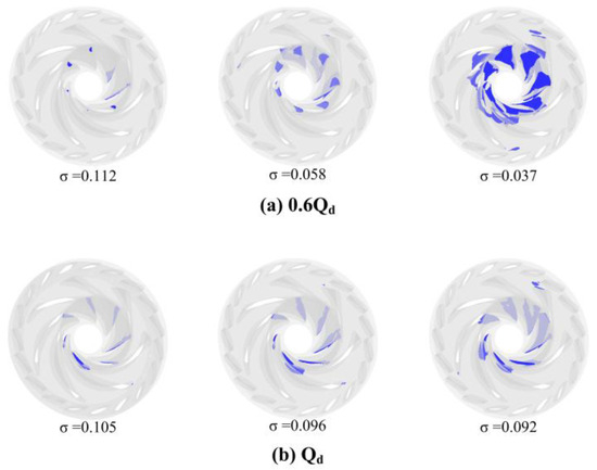 Figure 7 illustrates the total volume of cavitation bubbles in the impeller region under the conditions of 0.6 Qd and Qd at varying levels of cavitation. Figure 8 depicts the iso-surface formed by the cavitation volume fraction equal to 10% under the corresponding cavitation conditions. A comparison of these two figures reveals that when the cavitation number is relatively high and bubbles are just beginning to form, the volume of the bubbles is minimal, occupying a small portion of the flow channel and causing negligible disturbance to the flow field. As the cavitation number decreases to a critical point, cavitation develops to a certain extent, resulting in bubbles occupying part of the flow channel and affecting the flow field, which leads to a reduction in head. Conversely, when cavitation is fully developed, the bubbles occupy a significant portion of the space, severely impeding the normal flow of water.