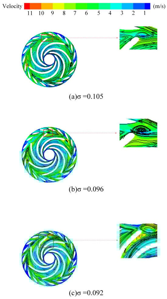 Figure 9 and Figure 10 illustrate the velocity contours and streamlines on Plane A for different cavitation levels at 0.6 Qd and Qd operating conditions. The flow separation on the suction side of the blade exit and the recirculation in the variable guide vane region result in the formation of large-scale vortex structures in the blade-free zone due to internal viscous forces. Compared to the Qd flow rate condition, the 0.6 Qd flow rate condition exhibits more severe backflow phenomena in the guide vane region, with vortex structures of significantly larger scales. As cavitation intensifies, the vortex scale in the bladeless region expands, the flow separation on the suction side of the blade increases, and water flows backward into the runner, forming a vortex near the suction side of the blade and runner. The vortices present in both the blade-free and runner areas significantly impede the flow within the field, ultimately resulting in a decline in the performance of the unit.