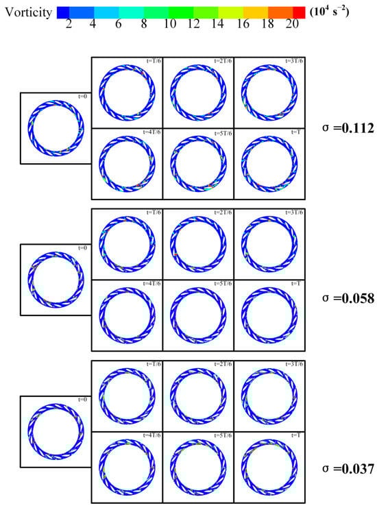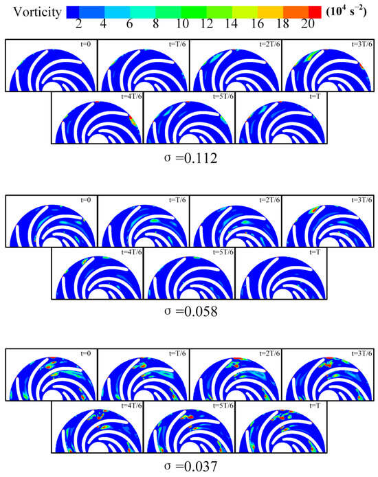 To investigate the evolution of vortices, Figure 12 illustrates the vortex evolution of the flow field at Plane A-1 over one rotation period under various cavitation conditions. When σ is 0.112, the changes in the blade tip vortex during one cycle are minimal, indicating that this cavitation condition primarily governs the vortex distribution in the impeller region. At the impeller outlet, vortices resulting from the shedding of the blade tip are present, with an evolution period approximately equal to one rotation period T. As the cavitation coefficient decreases to σ = 0.058, Plane A-1 generates vortices with consistent evolution periods at the same location. However, due to the development of cavitation, the intensity of these vortices is significantly higher than during the initial stages of cavitation. Additionally, other flow passages exhibit vortices of varying sizes that lack a clear evolutionary pattern. With the further reduction in the cavitation coefficient to σ = 0.058, cavitation becomes fully developed, resulting in a substantial presence of vortices with unstable evolution periods throughout the entire rotation cycle at Plane A-1.