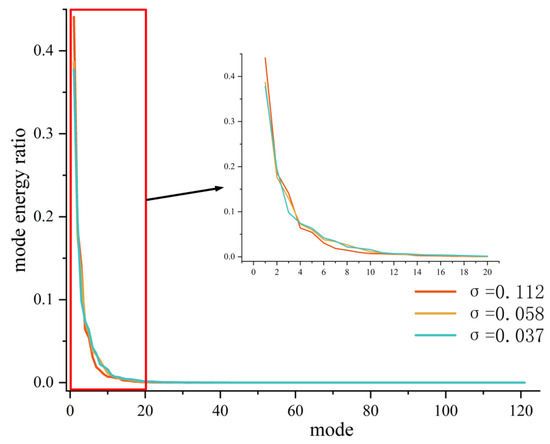 Figure 14 illustrates the proportion of energy contained in various-order POD modes, represented as the ratio of the mode characteristic values to the sum of the eigenvalues. It is evident that the first-order mode possesses the highest energy proportion, significantly surpassing that of the second-order and higher modes, indicating that it represents the predominant coherent structures within the vorticity field. Furthermore, for modes of order greater than eight, the energy proportion falls below 1%, and this proportion decreases gradually with increasing mode order. This suggests that the corresponding mode vorticity fields are influenced by the unsteady characteristics of the flow, rendering their contributions negligible. Additionally, across different levels of cavitation, the distribution of energy proportions among the various modes remains largely consistent. Notably, the energy proportion of the first-order mode diminishes as the degree of cavitation intensifies, indicating that the progression of cavitation enhances the unsteady characteristics of the vorticity field.