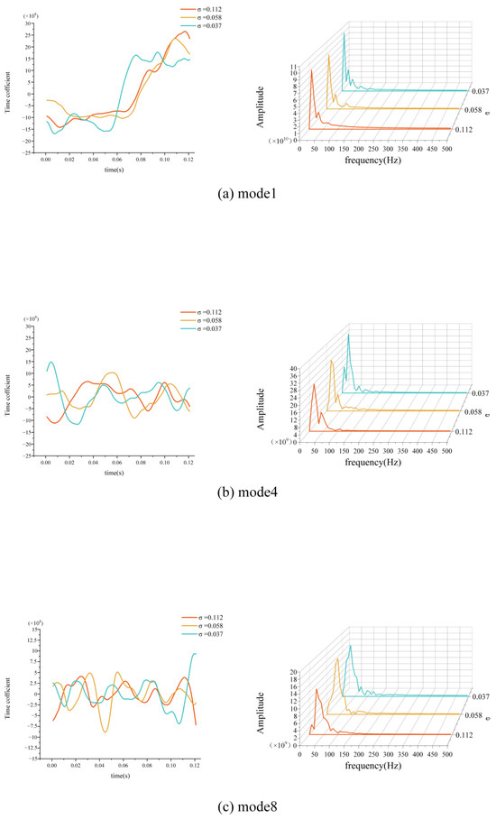 The time mode coefficients for the first, fourth, and eighth mode were subjected to a fast Fourier transform (FFT), resulting in the time evolution graphs and corresponding frequency spectra illustrated in Figure 15a–c. In Figure 15a, the evolution of the first-order POD mode’s time mode coefficients reveals a predominantly low frequency. This is attributed to a high energy proportion, indicating that the mode encompasses a significant amount of instability. As the instability of the cavitating flow field increases, the mode incorporates more unstable elements, leading to a chaotic evolution of the vortices. Conversely, as the mode order increases, the primary frequency in the time mode coefficients rises, while the energy proportion decreases, resulting in a reduction in the flow field information contained within the mode, thus rendering the frequency more distinct and clear.