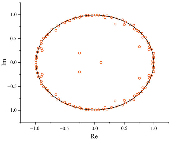 The POD method primarily identifies dominant coherent structures within a flow field by arranging modes based on their energetic contributions. The modes exhibit complex frequency components, and the DMD technique is employed for dimensionality reduction and decomposition of the flow field, allowing for the extraction of coherent structures at specific characteristic frequencies. This facilitates a comparative analysis of the dynamic characteristics of evolving vortex structures across different scales. Figure 17 illustrates the distribution of the DMD mode eigenvalues in the complex plane, where the horizontal axis represents the real part of the eigenvalues and the vertical axis represents the imaginary part. A majority of the eigenvalues cluster near the unit circle, indicating that the corresponding modes are relatively stable and represent the primary coherent structures of the vorticity field. Conversely, modes located within the unit circle are deemed unstable and do not correspond to the main vortex structures of the vorticity field. The parameters that describe the flow field information of each mode are the real parts of the spatial basis modes, with each set of conjugate eigenvalues corresponding to conjugate modes.