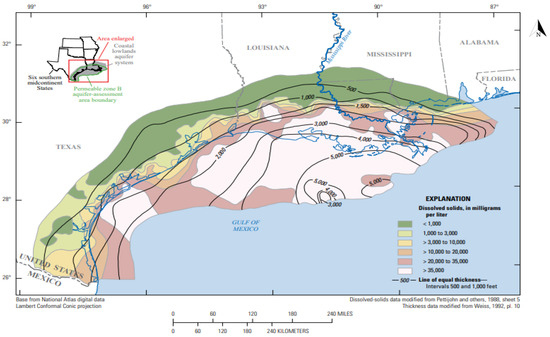 Dissolved solid concentrations and thickness in the Gulf Coast Regional Aquifer System [13].