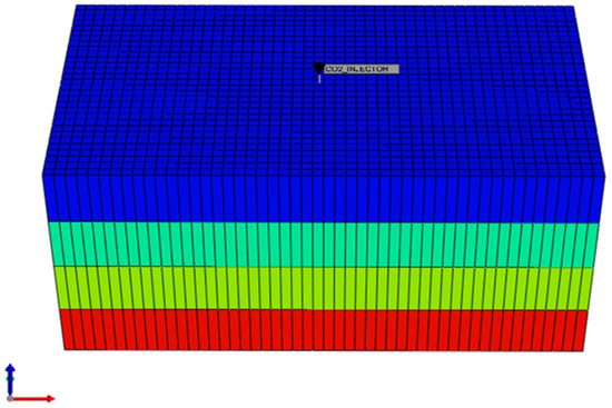 The model consists of a 3D grid with dimensions of 50 × 30 × 4 along the X, Y, and Z directions, respectively, with a width of 10 ft in all directions built with CMG 2021.10 software (Figure 2). This grid size was chosen to provide a sufficiently large area for observing horizontal migration patterns while maintaining a manageable number of cells for computational efficiency. The grid depth to the top is set at a depth of 5365 ft to reflect the conditions typical of the Illinois Basin Decatur Project’s geological setting. The four vertical layers in the grid allow CO2 injection at varying depths (5370 ft, 5375 ft, 5380 ft, and 5385 ft), enabling an assessment of how injection depth influences the horizontal spread and trapping of CO2 within the aquifer.