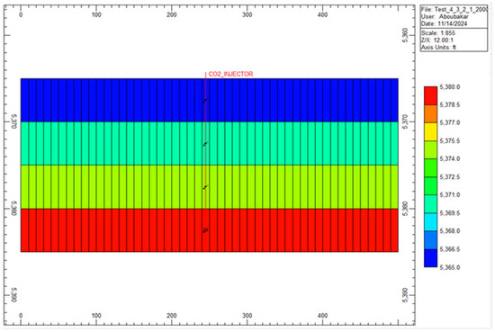 Supercritical CO2 was injected at a constant rate of 35,000 scf/day for three years to ensure a controlled comparison of injection performance at varying depths. Injection occurred at four discrete depths, 5370 ft, 5375 ft, 5380 ft, and 5385 ft, corresponding to the center of each of four distinct grid layers (Figure 4). This relatively small depth variation was selected to evaluate the influence of initial pressure and temperature conditions on CO2 migration while maintaining the CO2 in a dense, supercritical state to minimize buoyancy effects. Following the injection period, each simulation included a post-injection monitoring phase to track residual CO2 migration and assess long-term containment dynamics as the plume stabilized and interacted with the brine.