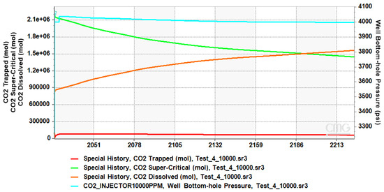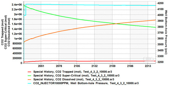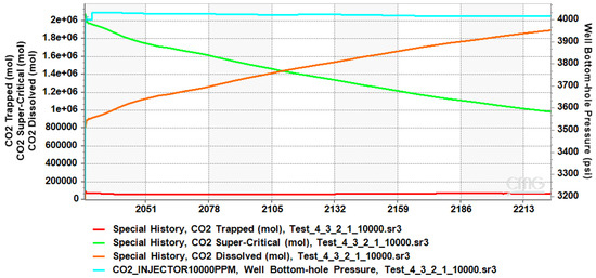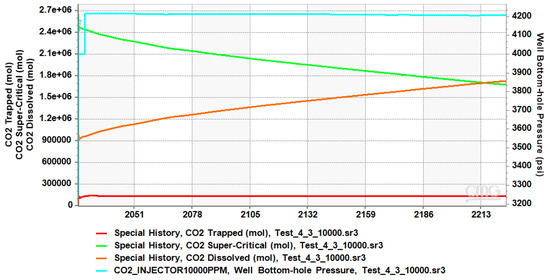 The sensitivity analysis of CO2 trapped and bottomhole pressure (BHP) over the simulation period reveals key insights into reservoir behavior. The CO2 residual trapped starts at 60,731 moles and steadily increases throughout the simulation, reaching a maximum of 107,112 moles in 2027. It then decreases, reaching a minimum of 98,700 moles in 2224, demonstrating effective residual and mineral trapping mechanisms. Meanwhile, the BHP begins at 4184 psi; toward the end of the simulation, the BHP decreases slightly, stabilizing at 4166 psi, indicating slight pressure dissipation within the reservoir. We noticed a total of 1.78 million moles of CO2 dissolved, 80,000 more moles than in the previous case. The supercritical CO2 dropped to reach 1.46 million moles, a decrease of 220,000 moles compared to the previous case (see Figure 10), leading to a total sequestration of 1.88 million moles of CO2.