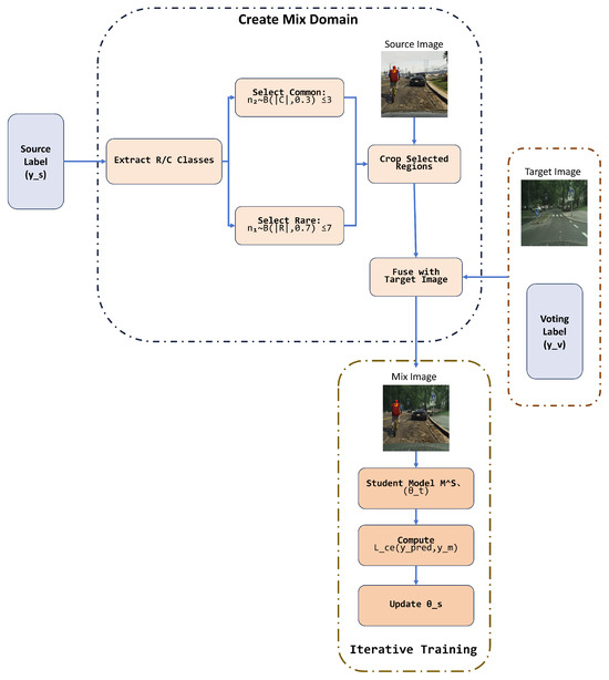 The mixed image and its corresponding labels were sourced from both the source and target domains. This cross-domain fusion introduces new data and prevents the model from learning to distinguish between the two domains based on dataset differences (e.g., quality and style) when performing the semantic segmentation task [40,41]. The implementation of the mixing module is shown in Algorithm 1.