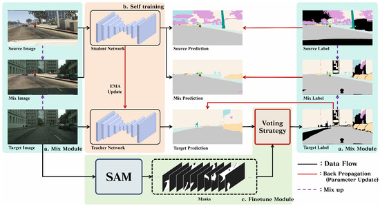 We utilize SAM to generate high-quality pseudo-labels within an iterative self-training framework using a teacher–student architecture with image mixing. To effectively integrate SAM into our proposed UDA framework, we addressed the two challenges mentioned above: excessive granularity in generated masks and the lack of semantic labels.