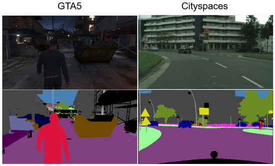 We used the GTA5 dataset [42], which includes 24,966 synthetic images with pixel-level semantic annotations, as our source dataset; and the Cityscapes dataset [43], a collection of street scene images from 50 different cities aimed at semantic understanding, as our target dataset. Figure 4 provides examples from both datasets. We applied Gaussian denoising to the datasets to reduce image noise. Additionally, following standard UDA practices, we resized each image in both datasets to 512 × 512 pixels, and we then applied horizontal flipping to augment the training samples.