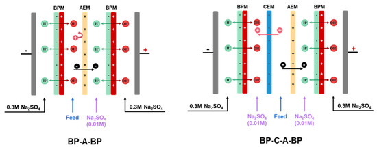 Under the action of a current field, all the electrolyte ions in the interfacial layer of the bipolar membranes will be depleted. Under these circumstances, water molecules will be dissociated into H+ and OH− ions to act as current carriers [33,34,35]. In the BP-A-BP cell configuration, the dissociated OH− ions directly enter the feed chamber, leading to the alkalization of the rotor cooling water.