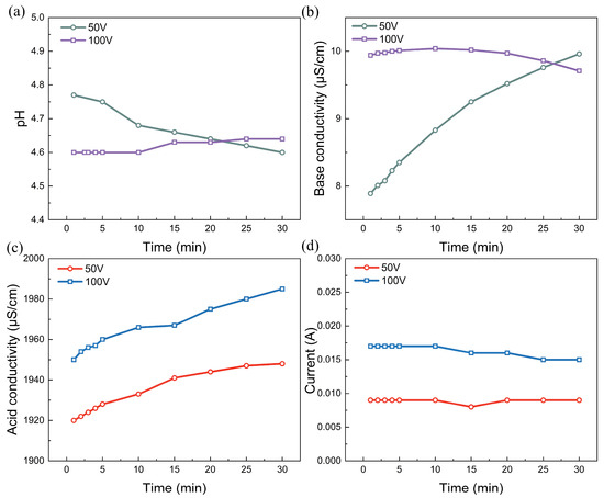 The alkalization performance: (a) time dependence of pH; (b) conductivity in the feed (base) chamber; (c) acid conductivity; (d) time dependence of the current in the simulated rotor cooling water via the BMED with BP-A-BP under a constant voltage of 50 V and 100 V. The flow rate was 200 mL/min and the chamber volumes were all 500 mL.