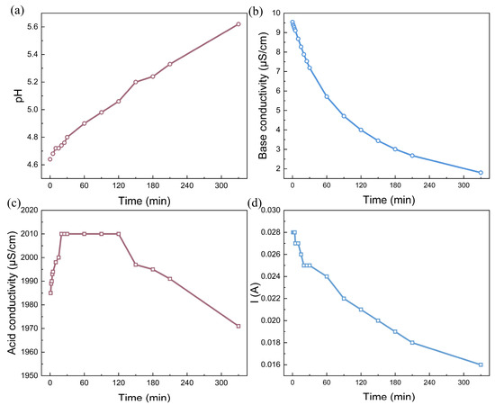 In contrast, water dissociation occurred when the voltage decreased to 200 V. Under this voltage drop, the current decreases with time, decreasing from 0.028 A (1.27 mA/cm2) to 0.016 A (0.073 mA/cm2). Figure 3a shows that the pH in the rotor cooling water increases from the initial value of 4.6 to 5.6 as the experiment progresses, providing direct evidence that it is possible to alkalize the solution without the consumption of any chemicals. Moreover, the conductivity decreases from 9.5 μS/cm to less than 2.0 μS/cm when water dissociation in bipolar membranes is activated. Under the initial pH of 4.6, most of the carbon dioxide in the water existed as carbonate acid with no small fraction of HCO3−. The hydroxide ions generated by water dissociation in the bipolar membrane shift the reaction (OH− + H2CO3 → HCO3− + H2O) forward. Under the influence of the current field, HCO3− migrates toward the anode and is transported across the anion-exchange membrane, leading to a decrease in the base conductivity. For the acid chamber, the conductivity first increased, then reached a plateau, and finally decreased over time. The increase in conductivity indicates the introduction of external ions, suggesting that the proton generated by water dissociation is generated. However, the proton further reacts with HCO3− to emit CO2 gas, leading to a slight decrease in the solution conductivity in the later period of the experiment [37]. Nevertheless, the BMED experiment with simulated rotor cooling water suggests that it is possible to alkalize the solution by an electrochemical reaction in bipolar membranes.