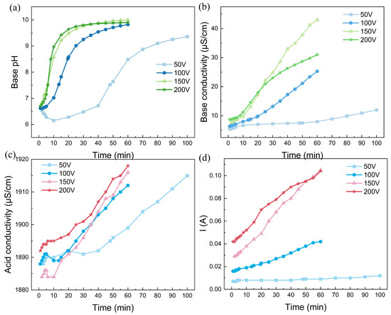 Based on the experiment described above, the BMED is also used for the alkalization of the real rotor cooling water, as shown in Figure 4. Unlike the simulated water, this rotor cooling water has an initial pH of approximately 6.8, indicating that the majority of carbonate ions exist as HCO3− rather than carbonate acid. The quality of this water still meets the major requirement for circulation to cool the coils of the synchronous condenser. Unfortunately, in practical cases, it is difficult to collect unqualified rotor cooling water without any alkalization. The high degree of dissolution of ionized carbon dioxide also causes the conductivity of real rotor cooling water to be greater than that of simulated water. This high conductivity leads to the occurrence of water dissociation in the bipolar membrane, even when 100 V is applied to the BMED stack. As indicated in Figure 4d, the larger the voltage drop, the greater the current. This phenomenon is consistent with Ohm’s law. Moreover, the solution pH clearly initially increased logarithmically and then reached a plateau at approximately 10.0 at the end of the experiment. The pronounced increase in the solution pH also indicated that water dissociation in the bipolar membrane occurred smoothly. In addition, the base conductivity also increased during the experiment, almost increasing to 40 μS/cm for a voltage drop of 200 V, indicating the excessive alkalization of the rotor cooling water. Considering that the equivalent conductance of CO32− is much greater than that of HCO3−, the abundant OH- ions generated by water dissociation in the bipolar membrane shifts the reaction (OH− + HCO3− → CO32− + H2O) forward [38]. Considering that the equivalent conductances of OH− and CO32− are much greater than those of HCO3− ions, the continuous replenishment of OH− will cause the system to be overly alkaline. It is necessary to monitor the conductivity curve precisely to determine the termination conditions for the experiments. Interestingly, a low voltage drop can alleviate the phenomenon of excessive alkalinity. Nevertheless, considering the swift pH variation trend, the BMED technique is expected to easily alkalinize acidic rotor cooling, which is not suitable for practical use.