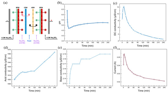For the application of bipolar membranes, the membrane cell configuration significantly affects the separation performance. Considering that BP-C-A-BP is the prevalent cell configuration for practical application, we also investigated the alkalization of the three-compartment rotor cooling water, and the results are depicted in Figure 5. Unlike the two-compartment BP-A-BP cell configuration, the three-compartment configuration uses one more piece of cation-exchange membrane and one more chamber. The rotor cooling water is fed into the chamber between the anion- and cation-exchange membranes. The base chamber and feed chamber are separately assembled. Owing to this special cell arrangement, all the ionized ions are depleted under the influence of the current field, as shown in Figure 5b. The conductivity of the rotor cooling water can be decreased to extremely low values (~2.0 μS/cm). However, this cell configuration cannot increase the pH of the rotor cooling water, as shown in Figure 5a. The pH even decreased when a bipolar membrane was activated. A possible reason is the leakage of H+ ions from the acid chamber into the salt chamber. Owing to the high mobility and small radius of H+, protons can be easily transported across anion-exchange membranes into the salt chamber. In the case of the BP-A-BP cell configuration, this small amount of proton leakage is neutralized by the OH− ions generated by water dissociation, leading to an overall increase in the solution pH [39]. In summary, the three-cell BP-C-A-BP configuration is not suitable for the alkalization of acidic rotor cooling water.