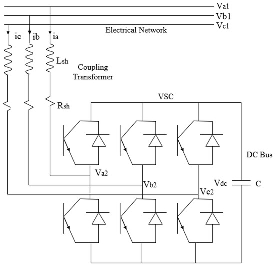 Through the correlation between the AC voltage of the system and the AC shunt voltage of the STATCOM, reactive power flow control is feasible. The STATCOM functions as a capacitor and injects reactive power into the system when the voltage across the terminals of the STATCOM exceeds the system voltage. Conversely, when the STATCOM voltage is lower than the AC voltage, it functions as an inductor and reverses the reactive power flow. Under normal operating conditions, the system maintains balanced voltage levels, which prevents any current exchange between STATCOM and the network. Figure 2 demonstrates the STATCOM’s voltage and current characteristics. The resistance represents the active power losses in the winding of the coupling transformer winding and switches, while inductance represents the coupling transformer leakage reactance [27].