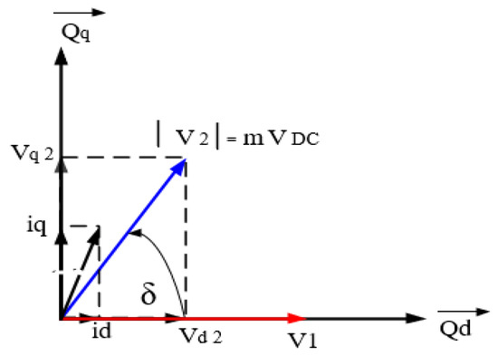 The voltage and current vectors are depicted in a park reference frame in Figure 3, while the phase shift angle and conversion ratio (m) can be calculated as