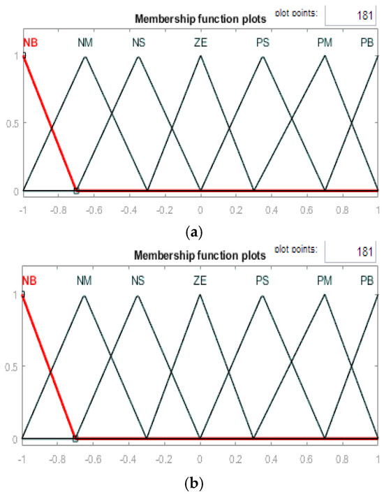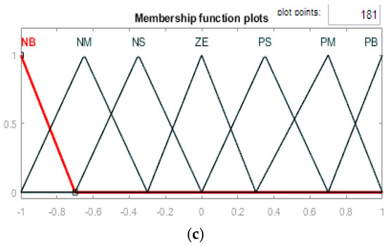 The FLC converts a linguistic control strategy into an automated design, with fuzzy rules generated by either an expert or a knowledge database. Seven fuzzy levels or sets (membership functions) were selected to provide a numerical characterization of each fuzzy logic state for improved outcomes: NB (negative big), NM (negative medium), NS (negative small), ZE (zero), PS (positive small), PM (positive medium), and PB (positive big), as shown in Figure 5.