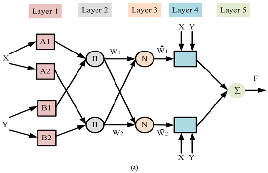 The variables A1, A2, B1, and B2 represent nonlinear parameters, while Ai and Bi denote fuzzy membership functions. p1, q1, p2, q2, and r1, r2 are linear parameters that function as design parameters established during the training process. The layers of the ANFIS procedure can be summarized as follows: