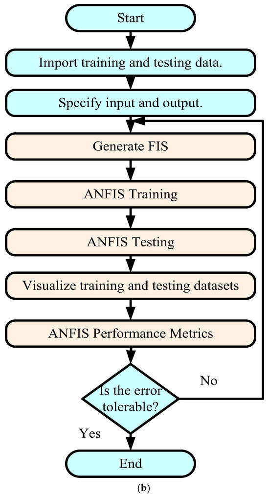 Implementation of the ANFIS controller. (a) The basic architecture of the ANFIS algorithm. (b) Flowchart of ANFIS implementation.